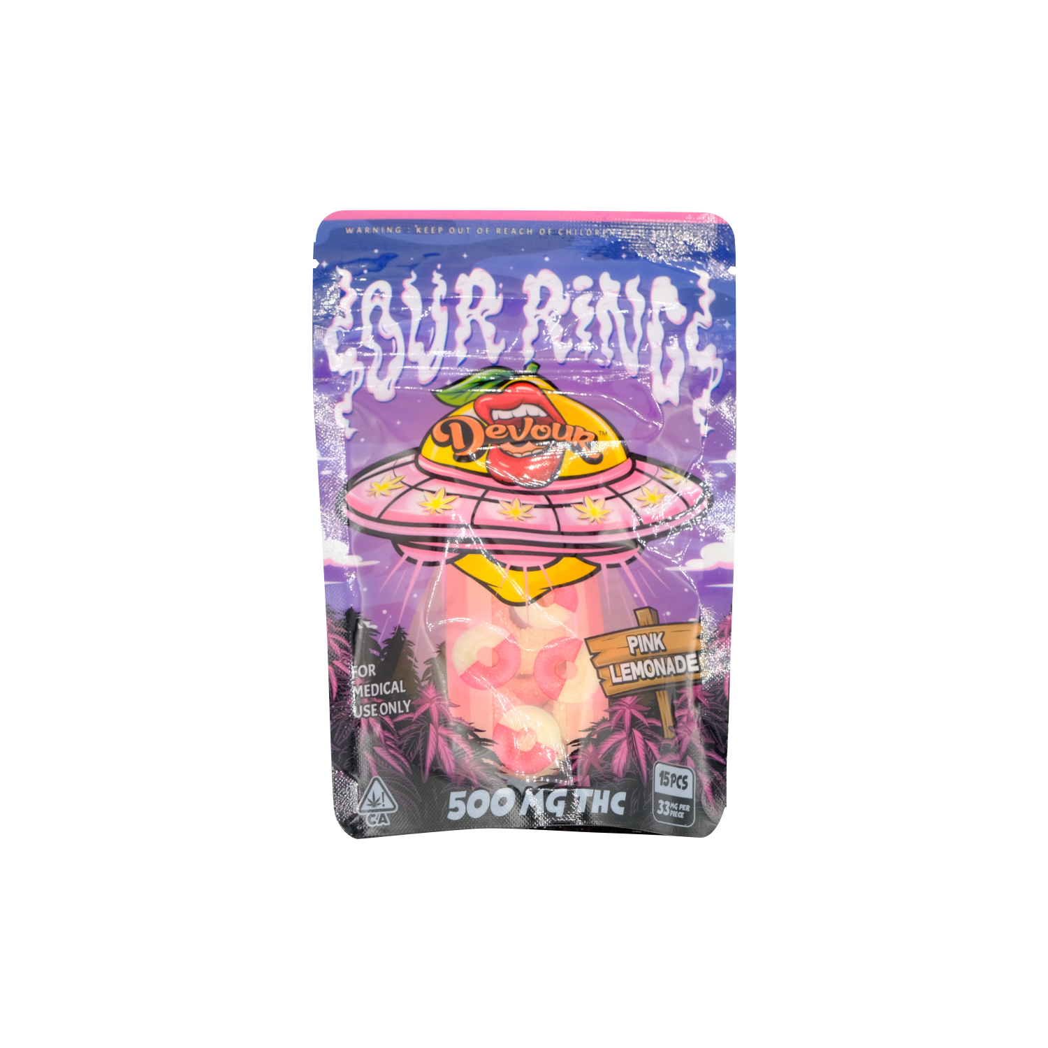Devour Pink Lemonade Rings 500MG THC offer a sweet and tangy pink lemonade flavor with a potent THC infusion. Perfect for both recreational and therapeutic use, these rings provide a consistent and enjoyable cannabis edible experience.